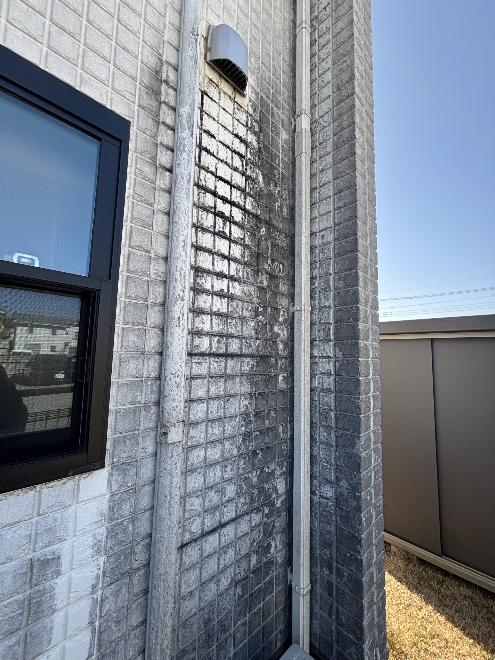 •外壁の汚れ・黒ずみ: 雨筋汚れや大気中の塵(ちり)による黒ずみを確認しました。塗膜の防汚機能が低下し、汚れが定着しやすい状態になっています。
